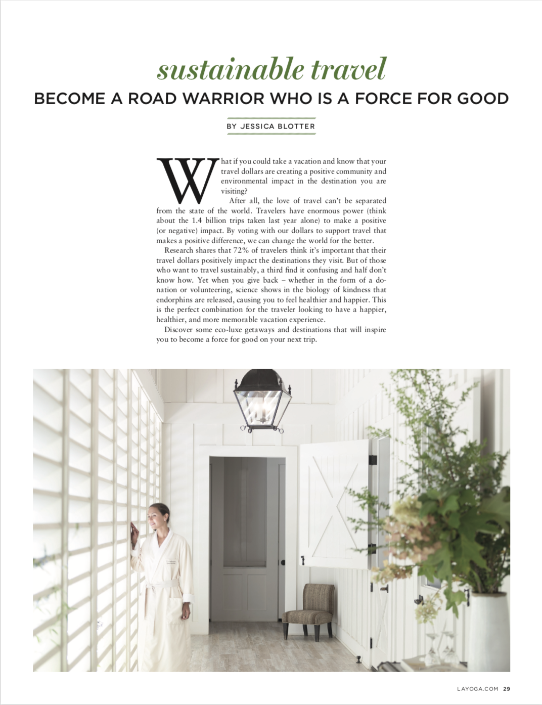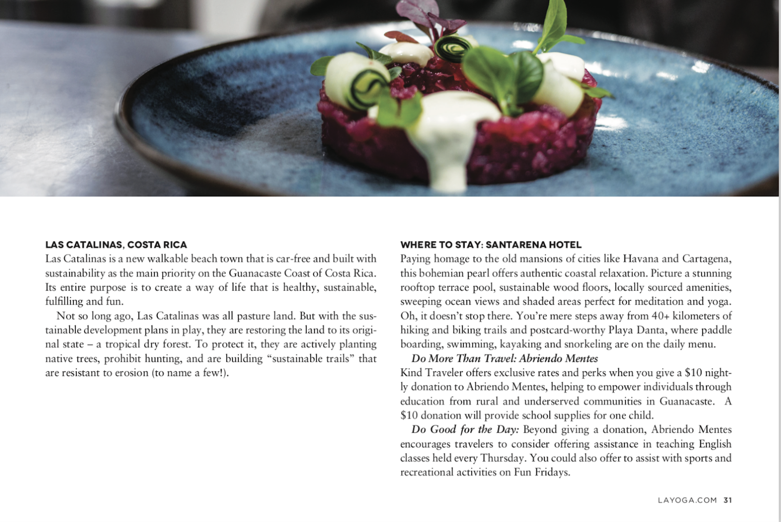 LA Yoga’s recent issue lists Las Catalinas as a top location for travelers seeking an environmentally and socially sustainable destination. The article by Jessica Blotter presents that many travelers want to positively impact the destinations they visit, and explains that there's a significant potential for travelers to do so.